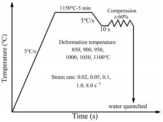 The specimens underwent a heating process to a temperature of 1150 °C at a rate of 5 °C/s and were maintained for a duration of 3 min in order to achieve complete solidification of the alloying elements within the austenite. Following this, the specimens were cooled to the deformation temperature range of 850–1100 °C at 5 °C/s and held for 10 s, subsequently deformed by 60% reduction with strain rates of 0.02–8.0 s−1. Finally, the deformed specimens were water quenched to room temperature to preserve the prior austenite microstructures. In order to ensure the reproducibility of the experiments, each group of experiments was performed three times.