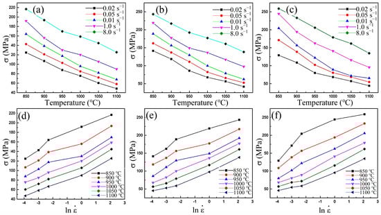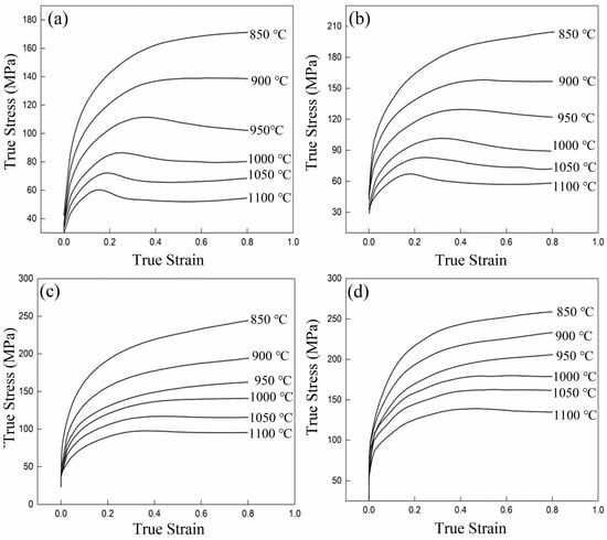 The alteration in flow stress signified the modifications in the microstructure during thermal deformation, particularly in dislocation density [32]. At an equivalent strain rate, an increase in deformation temperature facilitated the attainment of peak flow stress and reduced the necessary strain. Consequently, dynamic recrystallization of the deformed austenite was more probable. For instance, when the strain rate was 0.05 s−1, the true strain needed to achieve peak stress decreased from 0.181 to 0.316 as the deformation temperature rose from 1000 °C to 1100 °C. Furthermore, a lower strain rate resulted in a diminished strain requirement for the stress peak (Figure 2b,c). However, the occurrence of dynamic recrystallization of austenite at very slow strain rates was hindered when the temperature was excessively low (Figure 2c,d). It was evident that the three deformation parameters were interconnected and collectively impacted the deformed austenite dynamic recrystallization.