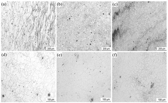 The prior austenite grains of SAE8620RH gear steel under various deformation temperatures with a strain rate of 0.1 s−1 are shown in Figure 4a,c. At 850 °C, the prior austenite exhibited elongation along the direction of deformation, displaying a pronounced directional characteristic (Figure 4a). Combined with the flow stress curve in Figure 2b, the true stress deformed at 850 °C with 0.1 s−1 increased continuously with increasing strain without the peak stress occurrence, showing an obvious work-hardening effect. At a temperature of 1000 °C, the elongated austenite grains completely disappeared and were replaced by equiaxed austenite grains measuring approximately 30.6 μm in size. Upon increasing the deformation temperature to 1100 °C, the equiaxed austenite grains exhibited an average size of approximately 45.3 μm. Furthermore, some coarse austenite grains were also observed, indicating that austenite grains had started to coarsen (Figure 4c).