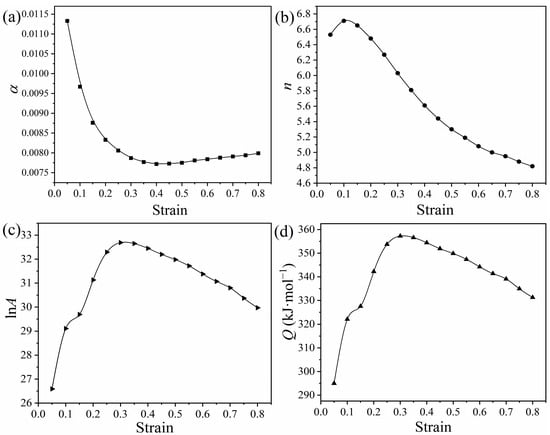 In Equations (1) and (2), only the effects of strain rate, deformation temperature, and stress on the flow behavior were considered. However, the effect of strain was ignored. In fact, the material-related parameters and thermal deformation activation energy have a strong correlation with strain [18]. To enhance the applicability of the constitutive model for the SAE8620RH gear steel and provide a more precise depiction of the stress-strain relationship, the influence of strain was incorporated into the model. The relationship between strain and stress can be inferred indirectly through an investigation of the variations in strain and material-related parameters. To ensure the accuracy of the derived constitutive equation, stress values were recorded at various deformation parameters using a strain interval of 0.05. By employing Equations (1) and (2) mentioned earlier, the material-related parameters were determined under different strain states (0.025–8.0 s−1) and deformation temperatures (850–1100 °C) within the range of real strain (0.05–0.8).