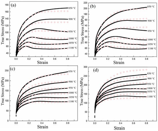 In order to assess the accuracy of the strain-compensated constitutive model (6) established for the SAE8620RH gear steel in predicting flow stress, the stress values calculated using Equation (4) were compared against experimental data, as shown in Figure 6. The new strain-compensated constitutive model yielded predicted values that were generally in agreement with experimental data at deformation temperatures ranging from 850 to 1100 °C and strain rates between 0.02 and 8.0 s−1. However, it was important to acknowledge that the predicted values at lower deformation temperatures, specifically at a strain rate of 8.0 s−1, exceeded the corresponding experimental data. This discrepancy can be attributed to the significant heat generated during instantaneous deformation at a high strain rate, which elevated the effective deformation temperature and consequently led to reduced actual stress levels.