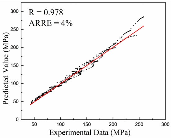 It is important to note that the accuracy of the R value is contingent upon the quantity of experimental data available. The value of AARE effectively characterizes the average absolute value of the relative error between the experimental data and the predicted values, thus providing a more precise assessment of the prediction accuracy of the strain compensation constitutive equation. It is widely accepted that an AARE value within a 5% margin is indicative of high prediction accuracy. The comparison between predicted values and experimental data is illustrated in Figure 7. The R value and AARE value were 0.978 and 4%, respectively, both falling within the permissible error range. This suggested that the predicted values derived from the new strain compensation constitutive equation for SAE8620RH gear steel could be considered reliable within the range of deformation temperatures (850–1100 °C) and strain rates (0.02–8.0 s−1).