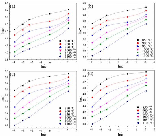 The functional relationship curve of for SAE8620RH gear steel is shown in Figure 8. It is evident that did not conform to a linear relationship, but rather exhibited nonlinearity. This observation further signified that the strain rate sensitivity index was variable and could not be treated as a constant. Then the value of m at different strains could be obtained by fitting the curves in Figure 8.