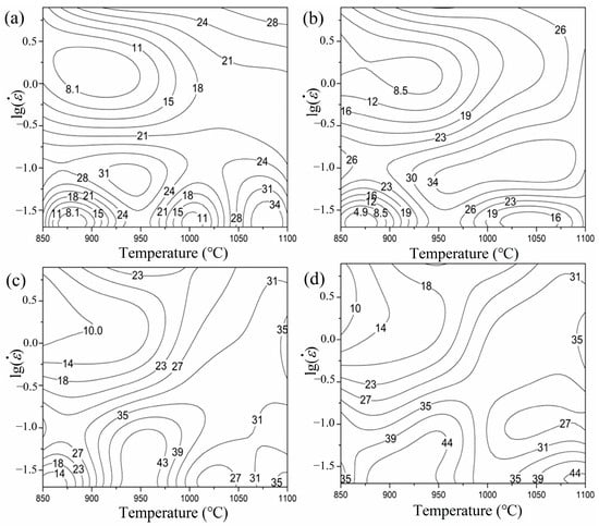 By utilizing Equation (14) and integrating the stress-strain data of the SAE8620RH gear steel across various deformation conditions, the numerical fitting enables the calculation of the value of η. Consequently, the power dissipation maps (2D contour maps) of SAE8620RH gear steel at different strains were plotted, as shown in Figure 9. It is important to note that, for the purpose of data visualization, the values of η presented in Figure 9 have been multiplied by 100. The power dissipation efficiency in the SAE8620RH gear steel exhibited a discernible upward trend as the strain increased, while maintaining a constant deformation temperature and strain rate. While the deformation temperature ranged between 1050 and 1100 °C with a strain rate of 0.02 s−1, the value of η exhibited a decrease with increasing strain. The phenomenon is similar to that reported by Han et al. in their study on stainless steel. Han et al. attributed this phenomenon to the low energy consumption resulting from grain boundary migration, which in turn affected dynamic recrystallization at high temperatures and low strain rates [41]. Furthermore, the deformation temperature was found to impact the power dissipation efficiency, with an increase in η observed as the deformation temperature rose, particularly at medium to high strain rates (ε ≥ 0.3 s−1).