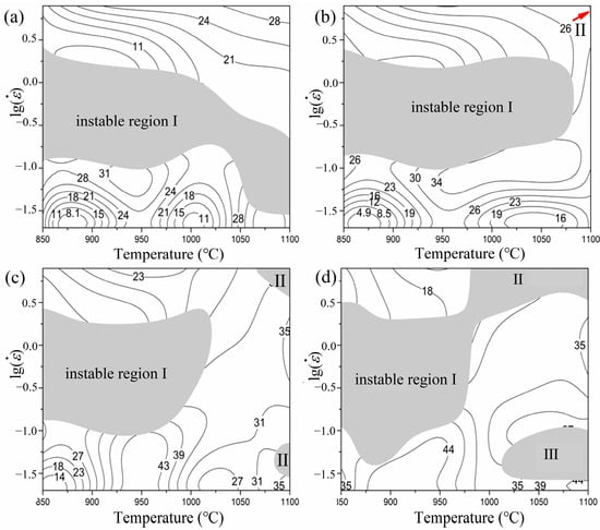 The magnitude of the η value is a criterion, albeit not the sole factor, for evaluating the hot workability of metals. In instances where thermal processing parameters obtain high η values, it is imperative to examine the associated microstructure and ascertain the presence of flow instability. This analysis aids in identifying the optimal deformation parameters. By utilizing Equation (15) and incorporating the previously calculated values of m and η, the instability parameter was determined. Subsequently, the instability maps of the SAE8620RH gear steel were graphed. Afterwards, the instability maps were overlaid onto the power dissipation maps, resulting in the acquisition of processing maps for the SAE8620RH gear steel at temperatures ranging from 850 to 1100 °C and strain rates ranging from 0.02 to 8.0 s−1, as depicted in Figure 10. The shaded area within the maps denotes the region of flow instability.