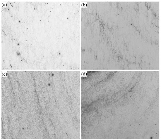 Figure 11 displays the boundaries of prior austenite grains at a strain of 0.7 under the corresponding parameters of different regions of the SAE8620RH gear steel. Deformed at 900 °C with 0.1 s−1 (Figure 11a), the η value approached 0.3, accompanied by an increased presence of dynamically recrystallized grains. The congruence between the microstructure and the η value was notable. However, the presence of large, deformed grains suggested the possibility of localized inhomogeneous deformation. Incomplete dynamic recrystallization and uneven grain size distribution rendered the SAE8620RH gear steel unsuitable for hot working under the conditions. Upon increasing the strain rate to 1.0 s−1 (Figure 11b), the calculated η value decreased to approximately 0.14, indicating minimal consumption of deformation storage energy for microstructure evolution. Correspondingly, the quantity of dynamic recrystallization grains exhibited a decrease and was substituted by a substantial number of deformed elongated grains and deformation bands. Consequently, this thermal process parameter was deemed unsuitable. Deformed at 950 °C with 0.05 s−1 (Figure 11c), the prior austenite grains were characterized by a dense and uniform distribution. However, as the temperature escalated to 1100 °C with a strain rate of 0.05 s−1 (Figure 11d), the average grain size experienced a significant increase with an uneven distribution of grains. Additionally, the presence of abnormally coarse grains resulted in suboptimal mechanical properties. Hence, it became imperative to prevent the occurrence of heterogeneous microstructures.
