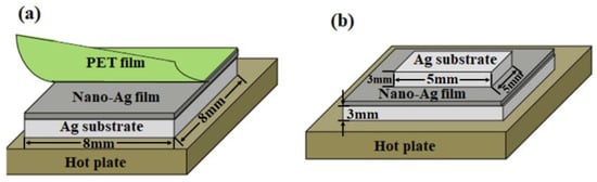 As illustrated in Figure 1a, commercially available Ag ingots were cut into cubes in dimensions of 5 × 5 × 3 mm and 8 × 8 × 3 mm, mechanically polished with 4000-mesh sandpaper, and cleaned in an ultrasonic alcohol bath. Then, nano-Ag film in a size of 8 × 8 mm was placed on the Ag substrate in a dimension of 8 × 8 × 3 mm and heated at 120 °C under a pressure of 5 MPa for 6 min. After heating, the polyethylene terephthalate (PET) film was manually removed from the nano-Ag film. As illustrated in Figure 1b, sample assembly was completed by loading an Ag cube in a dimension of 5 × 5 × 3 mm on the prepared nano-Ag film, and sintering was conducted in atmosphere under the conditions listed in Table 1. The shear strengths of the sintered Ag/nano-Ag film/Ag joints were measured on a Shimadzu EZ-LX universal tester (Shimadzu, Kyoto, Japan) using a customized sample holder. The shear speed was kept at 5 mm/min, and each shear strength value was averaged from at least 5 measurements. Microstructural characterization of the sintered joints before and after the shear tests was performed on a Hitachi SU-1510 scanning electron microscope (SEM). A FEI TECNAI F20 field-emission transmission electron microscope (TEM) was used for phase analysis of the selected sintering sample. TEM samples were prepared using a FEI Helios Nanolab-600i dual-beam focused iron beam (FIB) milling machine. A G200 nanoindenter installed with a hot stage was used to simulate the coarsening behavior of the nano-Ag film in the sintering process at corresponding temperatures.