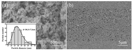 (a) Morphology of the original nano-Ag film with an insert of the distribution of Ag particle sizes. (b) Cross-sectional SEM image of a sintered Ag/nano-Ag film/Ag joint.
