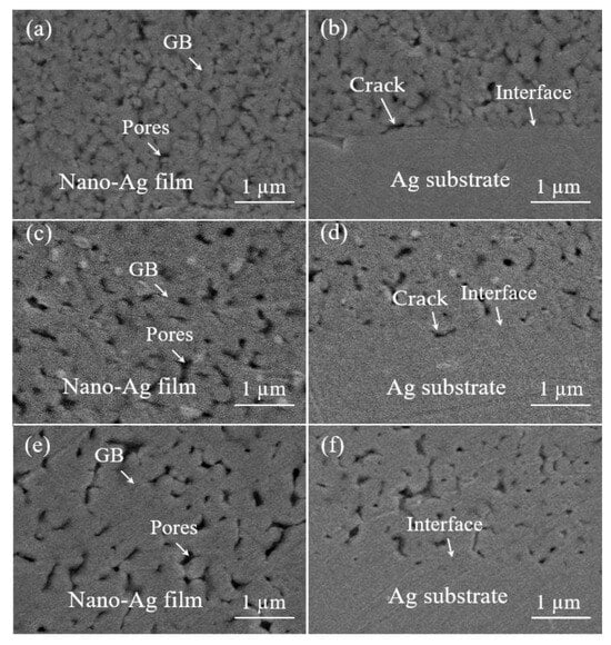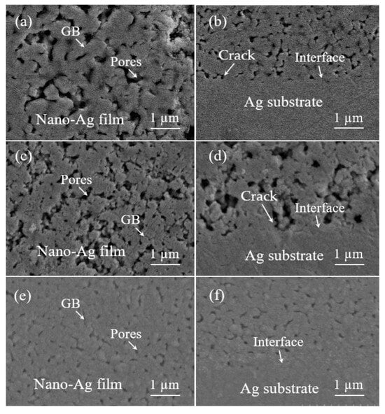 Figure 3 shows the cross-sectional microstructure of Ag/nano-Ag film/Ag joints after isothermal sintering at temperatures of 210, 250, and 290 °C for 15 min, under an applied pressure of 5 MPa. As revealed in Figure 3, the sintering temperature showed an obvious influence on the sintered microstructure of the nano-Ag film, as well as the interface microstructure between the nano-Ag film and Ag substrates. As shown in Figure 3a, after sintering at 210 °C, uniform pores and superfluous grain boundaries could be observed in the nano-Ag film, and a micro-crack was visible at the interface between the nano-Ag film and the Ag substrate. As shown in Figure 3b, an indistinct segregation layer existed at the interface between the nano-Ag film and Ag substrates. As shown in Figure 3c,d, when the sintering temperature was increased to 250 °C, the Ag grains in the nano-Ag film were clearly coarsened, and the grain boundaries merged to form isolated pores. Moreover, the segregation layer disappeared after the sintering temperature was increased to 250 °C. As displayed in Figure 3e,f, a further increase of the sintering temperature to 290 °C resulted in a corresponding coarsening of the nano-Ag grain size, as well as the formation of a well-bonded interface between the nano-Ag film and Ag substrate. It is, therefore, clear that the increase of the sintering temperature promoted the coarsening of nano-Ag grains and the formation of interfacial bonding between the nano-Ag film and Ag substrates. This is similar to a previous study on the nano-Ag paste, where the remaining organic solvents may have impeded the adhesion of Ag particles at temperatures below 260 °C [].
