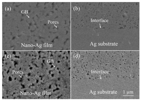 Figure 5 displays the cross-sectional microstructure of Ag/nano-Ag film/Ag joints after isothermal sintering at 250 °C for 5 and 30 min, under an applied pressure of 5 MPa. According to Figure 5a,c, after sintering under 5 MPa, the dwell time at a sintering temperature of 250 °C had a negligible influence on the sintering and bonding microstructures of the nano-Ag film on the Ag substrate: after elongating the dwell time from 5 to 30 min, the porosity of the nano-Ag film remained almost unchanged. According to the magnified SEM image in Figure 5b,d, the size and number of pores in the vicinity of the interface between the nano-Ag film and the Ag substrate was almost identical after sintering for 5 and 30 min.