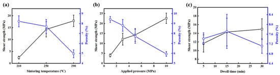 Shear strength and porosity of sintered Ag/nano-Ag film/Ag joints plotted against (a) sintering temperatures, (b) applied pressures, and (c) dwell time at a peak temperature of 250 °C, respectively.