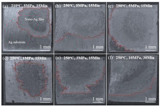 Figure 7 shows the fracture morphologies of Ag/nano-Ag film/Ag joints sintered under variable conditions, and the residual nano-Ag film is marked by a red dotted line. As shown in Figure 7a, a small amount of residual nano-Ag film was observed on the Ag substrates. This means that after sintering at 210 °C, the fracture was propagated mainly along the interface between the nano-Ag film and the Ag substrate, and hence a poor interfacial bonding was achieved. As revealed in Figure 7b, after the sintering temperature was increased to 250 °C, the area ratio of the residual nano-Ag film was obviously increased, indicating that the fracture along the interface between the nano-Ag film and the Ag substrate was suppressed. As shown in Figure 7c, when the sintering temperature reached 290 °C, the surface of the Ag substrate was almost completely covered by the nano-Ag film, evidencing that the fracture was propagated in the nano-Ag film and a relatively reliable interfacial bonding was attained at 290 °C. As shown in Figure 7d, after sintering at 1 MPa for 15 min at 250 °C, the area ratio of the residual nano-Ag film was also limited, suggesting that the Ag/nano-film/Ag joint was fractured along the interface between the Ag substrate and the nano-Ag film. As revealed in Figure 7b,e, after increasing the applied pressure from 1 to 3 and 5 MPa, the area ratio of the residual nano-Ag film was congruently increased, and the propagation of the fracture along the interface between the nano-Ag film and the Ag substrate was inhibited. Clearly, the increase of both the sintering temperature (Figure 7a–c) and the applied pressure (Figure 7b,d,e) resulted in an increase of the area ratio of the residual nano-Ag film, which corresponds to how the propagation of the fracture was improved at the interface between the nano-Ag film and the Ag substrate. However, it should be noted that, after increasing the applied pressure to 10 MPa and elongating the dwell time at 250 °C to 30 min, the fracture morphology was similar to that of the sample sintered at 290 °C, i.e., the volume of the residual nano-Ag film was increased, but the fracture at the interface between the nano-Ag film and the Ag substrate could still be observed, as seen in Figure 7f.