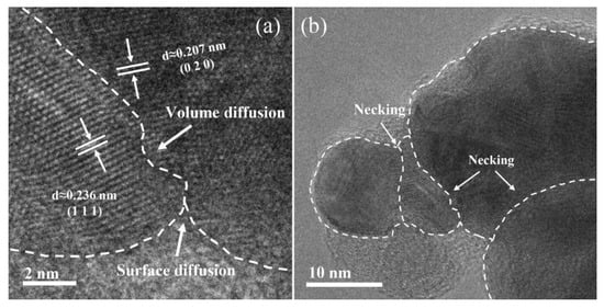 To obtain a better understanding of the influence of the sintering temperature and applied pressure on the coarsening behavior of the nano-Ag film, hot-nanoindentation and TEM techniques were used to reveal the coupled effects of the sintering temperature and applied pressure on the sintering mechanism of the nano-Ag film, as well as the microstructure and bonding strength of Ag/nano-Ag film/Ag joints in the early stage of the sintering process at relatively low temperatures. Figure 8 displays TEM images of the nano-Ag film after sintering at 250 °C for 15 min under 5 MPa. As shown in the low-resolution TEM micrograph in Figure 8a, after the sintering reaction at 250 °C, the Ag nanoparticles collided and merged. According to the findings of Yan et al. [], the volume diffusion between Ag nanoparticles in nano-Ag pastes can be activated at 250 °C. This can be evidenced by the volume diffusion between the (111) and (020) crystal planes of Ag particles, which led to the necking and recrystallization of Ag particles, as shown in Figure 8a. However, as shown in Figure 8b, the Ag particle with a grain size around 30 nm was found in the sintered nano-Ag film. Therefore, the TEM results evidenced that both the volume and surface diffusion could also be activated at 250 °C, but the coarsening and ripening rate was sluggish and the nano-Ag-film could not be fully densified in 15 min under an applied pressure of 5 MPa.