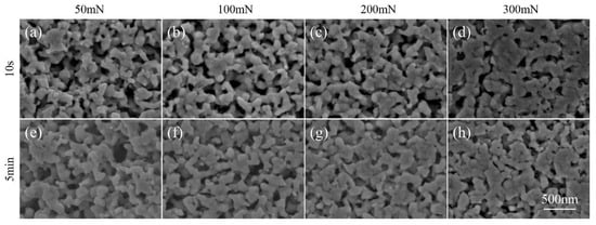 In order to further investigate the effect of applied pressure on the coarsening of the nano-Ag film in the low-temperature sintering process, hot nanoindentation was carried out at 250 °C, and Figure 9 displays the surface morphology of the nano-Ag film after indentation at peak loads of 50, 100, 200, and 300 mN for 10 s and 5 min. As shown in Figure 9a–c, at 250 °C, the use of peak loads of 50, 100, and 200 mN can lead to the deformation of the nano-Ag film. Only after the peak load was increased to 300 mN did the coarsening of Ag particles in the nano-Ag film become obvious. Note that, presuming an even distribution of applied force on the conical tips in the nanoindentation process, the use of a peak load of 50 mN corresponds to an applied pressure of 3.19 GPa, which is three orders of magnitude higher than the maximum applied pressure in this work (10 MPa). Moreover, after extending the dwell time from 10 s to 5 min, it was found that the microstructure of the indented nano-Ag film was similar to that generated under the same peak load and temperature (Figure 9e–h), indicating that the use of an applied pressure of more than 3 GPa cannot guarantee a rapid coarsening of the nano-Ag film. This is also in agreement with phase diagram information, in that the change in applied pressure from 1 to 10 MPa should have a negligible influence on the sintering behavior of the Ag film and the microstructure and bonding strength of Ag/nano-Ag film/Ag joints. However, this inference contrasts with the shear test results in Figure 4 and Figure 6 and in previous studies. Firstly, the increase of applied pressure resulted in an improvement in the bonding strength, and secondly, the measured bonding strength values of Ag/nano-Ag film/Ag joints were considerably lower than their counterparts sintered by nano-paste [,].