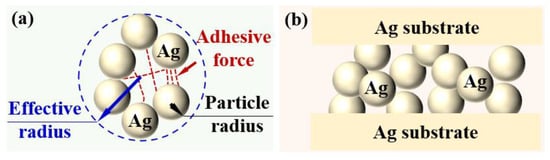 Schematic illustration of the (a) original effective radius and (b) pressure-induced redistribution of nano-Ag particles in the sintering process.