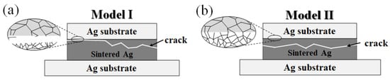 Finally, the fracture analysis of Ag/nano-Ag film/Ag joints sintered under variable conditions also cast light on the understanding of the failure mode of these nano-Ag-based die-attachment materials, and two fracture models dependent on sintering temperatures are proposed in Figure 11. As illustrated as Model I in Figure 11a, the fracture of Ag/nano-Ag film/Ag joints sintered at a relatively low temperature was mainly initiated at the interface between the nano-Ag film and the Ag substrate, and then propagated from the interface to the sintered nano-Ag film matrix. This indicates that at the lower sintering temperature, the diffusion between the nano-Ag particles and the Ag substrate is too sluggish to form a reliable interfacial bonding. As illustrated by Model II in Figure 11b, when the sintering temperature was increased, i.e., to 290 °C in this work, the diffusion between the nano-Ag particles and the Ag substrate was enhanced and, as a result, a reliable interfacial bonding was prone to form. This inhibited the crack formation at the nano-Ag film and Ag substrate interface, making the crack propagation remain inside the sintered nano-Ag film. Clearly, in order to ensure the integrity of sintered joints fabricated using nano-Ag film, it is of vital importance to achieve a reliable interfacial bonding.