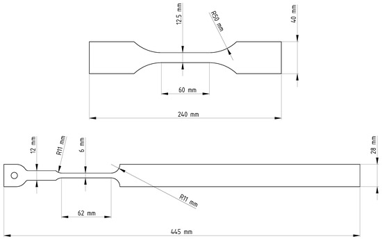 The straight tensile geometries used to test the strain rate dependency of the two grades. The upper geometry was used for the quasi-static experiments and the lower was used for high-speed testing.