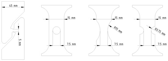 The gauge area of the different sheet tensile specimen used to capture different triaxialities. From left to right: shear specimen, hole specimen, notched specimen with a 15 mm radius, and notched specimen with a 3.75 mm radius.