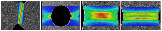 Qualitative strain field distribution in 2D DIC images of the shear, hole, and the two notched tensile specimens presented in Figure 2 from left to right.