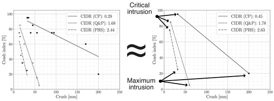 Due to the linear nature of the CIDR, it opens up the possibility to reduce the number of crash box tests by using high-speed imaging to track the intrusion process. By studying the CIDR results from the extensive crash box testing conducted by Frómeta et al. [28], two critical measuring points could be determined, namely the critical intrusion (the intrusion level where the material starts to crack, i.e., when the CI dips below 100) and the CI at maximum intrusion. Reproduced results (The points were estimated from scatter plots since no raw data were available, and thus the exact CIDR values could not be reproduced. The overall trends are however similar enough.) from three of the nine tested steel grades are presented in Figure 7 (left) together with a plot where a linear interpolation between the critical intrusion and CI at maximum intrusion for each grade, respectively (right). It is readily shown that interpolating between these critical points gives a good estimation of the evaluated CIDR based on a larger set of boxes. One should keep in mind that there are uncertainties already introduced in the method because of subjectivity concerning detecting cracks and deciding their lengths. By choosing a critical intrusion of 75%, corresponding to cracks with lengths of 10 mm, which are relatively easy to detect using high-speed imaging combined with 3D-DIC, this critical point could be estimated with satisfactory accuracy. By setting the critical intrusion to 75% for each of the steel grades in Figure 7, the results changed from to for the CP steel grade and from to for the Q&P steel grade. Similar results were obtained for the rest of the tested grades in the study [28]. To further confirm the two-point estimation of the CIDR, a comparison with the CIDR determined by a complete set of CI at different levels of intrusion was performed. To reduce the experimental spread and to obtain a better estimate, a series of 3 components was tested for each grade.