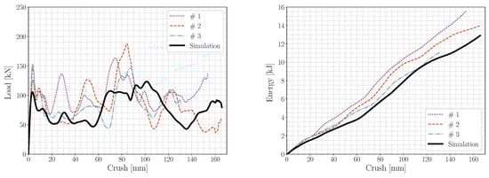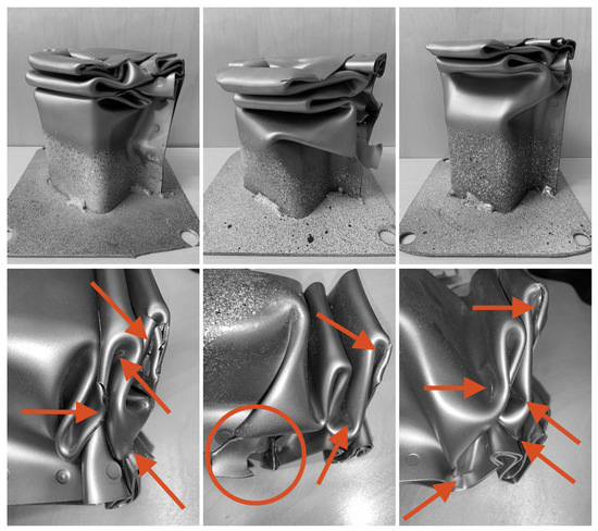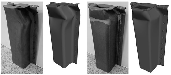 The aim of the numerical simulations was to validate the calibrated material and damage models by comparing the results from the axial compression experiments with the corresponding simulated outcome. The crash box experiments were modelled using FE software LS-DYNA® version R14 from LSTC (Ansys, Inc. Canonsburg, PA, USA). well known for its suitability for dynamic simulations due to its explicit time integration scheme. Since the crash box was precrushed by the manufacturer due to reasons explained earlier, an initial simulation was performed to reverse engineer the observed crush from the received boxes. The box was locked in position and deformed by a moving rigid plate, which first compressed the box followed by an unloading step. Due to the quasi-static conditions during the experimental precrushing, an implicit time integration scheme using fully integrated shell elements was utilised. An automatic single surface mortar contact was used, and the spot welds were simulated using tied contacts with a beam offset. The resulting geometry for the precrushed crash boxes compared with the real component can be seen in Figure 8.