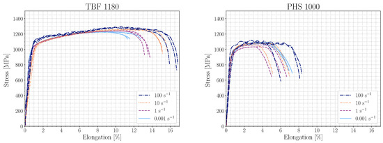 Engineering stress versus elongation curves for the TBF 1180 grade (left) and PHS 1000 grade (right) for the strain rates of 0.001 s, 1 s, 10 s, and 100 s.