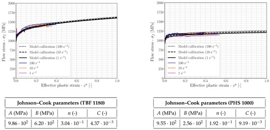 The flow stress curves obtained from applying the isotropic version of SMM on the notched R3.75 geometry are presented in Figure 2. The results for the two grades are presented in Figure 10 together with curves based on the simplified Johnson–Cook model with calibrated parameters. The TBF 1180 grade shows a larger strain hardening compared to the PHS 1000 steel grade.