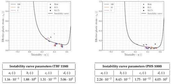 Equation (8) can then be calibrated by curve fitting using sheet tensile test geometries undergoing some diffuse necking, such as regular uniaxial tensile specimens or notched specimens, either together with the fracture strain predicted from the fitted failure locus or by the failure strain from equi-biaxial experiments. In this work, no equi-biaxial calibration (triaxiality of 0.66) testing was done, so it was assumed that the instability curve coincided with the failure curve at that stress state. The shape of the curve was similar to published curves [56,57] and was also easy to calibrate and easy to compare between materials, but it is important to note that this was a purely mathematical construct used to extrapolate the instability curve beyond the typical tensile tests for recreation purposes and was by no means intrinsic. Other authors have investigated material instability in more detail [61,62,63,64,65].