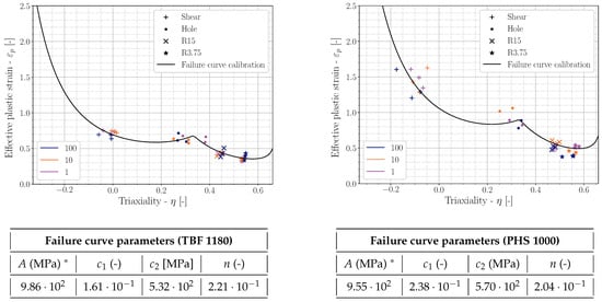 The calibrated MMC failure curves are presented in Figure 12 with the plot interval beginning at the cutoff value of the triaxiality value in accordance with previously published work by other authors [41]. The scatter points represent the integrated average triaxiality from Equation (4) for the different tensile geometries used for the curve-fitting procedure. The local ductilities for the shear stress and the uniaxial tensile stress state are significantly higher for the PHS 1000 grade compared to the TBF 1180 grade.