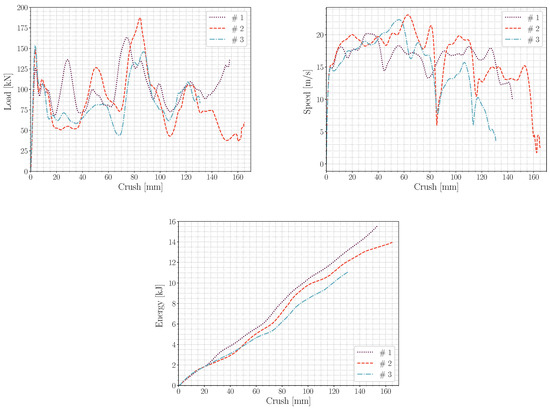 The load response (top left), crush-speed evolution (top right), and energy absorption (bottom) for the predeformed PHS 1000 crash boxes as a function of crushing distance. The results were filtered using a CFC1000 filter (ISO-6487).