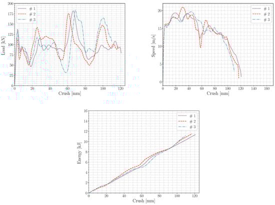 The load response (top left), crush-speed evolution (top right), and energy absorption (bottom) for the predeformed TBF 1180 crash boxes as a function of crushing distance. The results were filtered using a CFC1000 filter (ISO-6487).