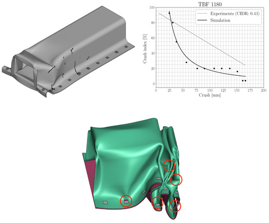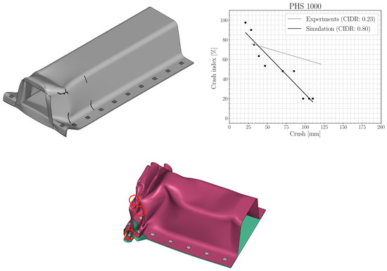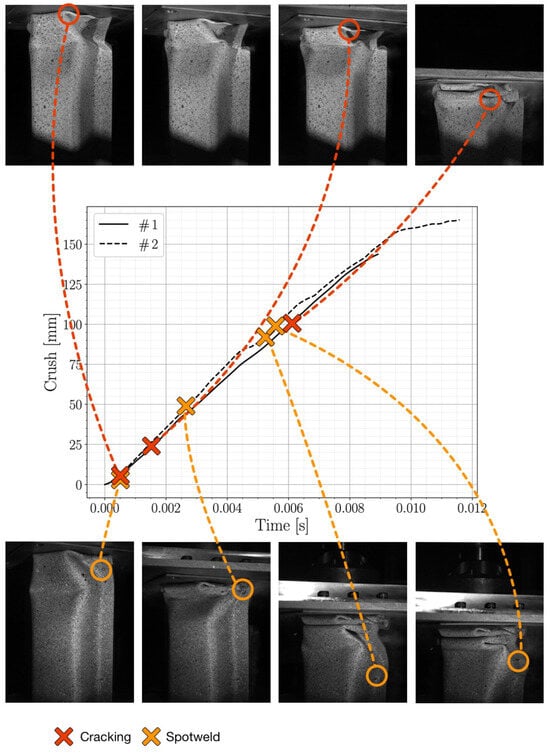 However, to prove the predictability of the simulation models, it is of crucial importance to validate them to full-scale experimental component testing. In the automotive industry, axial compression and three-point bending tests of crash boxes are often the components of choice since these are used for energy absorption and anti-intrusion in vehicles to protect the passengers. These are usually performed using an accelerated mass where the deformation intensity is generally controlled by modifying the load mass speed. The crashworthiness of the components is determined from the severity of cracking, sometimes quantified with a crash index (CI). Such indices based on visual inspection have been published by other authors, both for axial compression [25,26] and three-point bending [27]. In order to take damage evolution into account and to circumvent the difficulties with spot welds, Frómeta et al. [28] proposed a crash index decreasing rate (CIDR). However, to obtain the CIDR, several axial compression tests are generally needed at different crushing depths to determine the crash index evolution, costing both time and material.