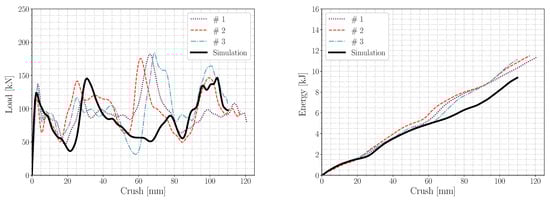 The validation of damage models is often conducted by comparing the final state of the simulation with the postexperimental results of the tested components. Here, the validation step was expanded by taking the evolution of the damage into account. The crash index evolution technique used for the experiments in Figure 6 was therefore also used to investigate the selected damage evolution model in the FE analysis. By measuring the coherent array of deleted elements as a “crack”, the evolution of the damage can be tracked with the crushing depth during simulation. The authors are aware of the fact that the deleted elements from a ductile damage model are not real cracks, but it does allow the study of the evolution of the damage for a more extensive comparison with experiments. This is in contrast to just comparing the resulting damage after the maximum crushing distance after the experiment. The 3D-DIC method also allows for a direct comparison of strain fields between the FEM and the experiment.
