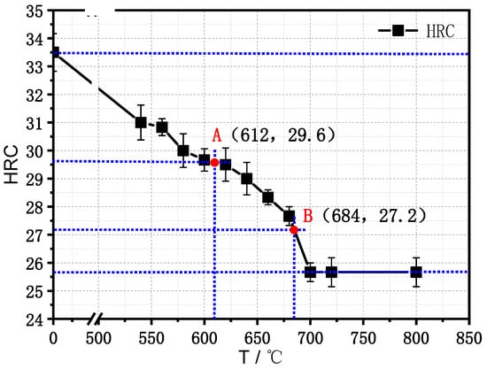 The annealing temperature (time) can correspond to the start temperature and end temperature of recrystallization when hardness reduction reaches 50% and 80% of the total hardness reduction, respectively. As can be seen from the curve in Figure 1, recrystallization of the Ti-70 alloy sheet starts at 612 °C for 30 min, and the HRC hardness decreases by 50% to 29.6, as shown by point A. Recrystallization was completed after holding at 684 °C for 30 min, and the HRC hardness decreased by 80% to 27.2, as shown by point B.