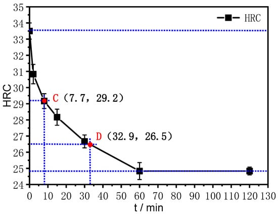 From the curve in Figure 2, it can be seen that recrystallization of the Ti-70 alloy sheet begins at 700 °C for 7.7 min, and the HRC hardness decreases by 50% to 29.2, as shown by point C. Recrystallization was completed after holding at 700 °C for 32.9 min, and the HRC hardness decreased by 80% to 26.5, as shown by point D.