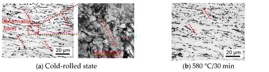 The starting temperature and ending temperature of recrystallization observed by the “metallographic method” are basically consistent with those observed by the “hardness method” in Figure 2, and the sheet can be completely recrystallized at 700 °C for 30 min. Furthermore, it can be confirmed by EBSD that the recrystallization of the sheet after holding at 700 °C for 30 min is as shown in Figure 5. The EBSD recrystallization fraction statistical method is an effective method to study the recrystallization process of materials. In the study of the recrystallization of materials, EBSD technology can be used to measure the change in the crystal orientation of materials. By measuring the change in the crystal orientation, the degree and distribution of recrystallization of the material can be determined. The EBSD recrystallization fraction statistical method is a method to measure the recrystallization fraction of materials using EBSD technology [35,36].