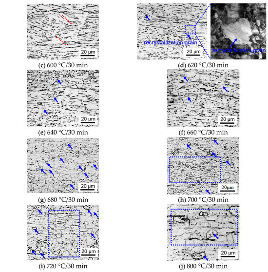 Figure 3 describes the microstructure evolution and recrystallization process of Ti-70 cold-rolled sheets at different temperatures. It can be seen from Figure 3 that with the increase in annealing temperature, the recrystallization process of the Ti-70 alloy sheet will be more complete, and the microstructure will gradually evolve from obvious cold-rolled fiber (as shown in Figure 3a–d) to more recrystallization grains (as shown in Figure 3e–g). The recrystallization process will be gradually completed at higher temperatures and grain growth [28] will occur (as shown in Figure 3h–j). The α grains are dramatically elongated and some deformation bands marked by the red dotted lines can be seen in the grain interior in the cold-rolled sample as shown in Figure 3a. The deformation bands consist of a high density of dislocations. After heat treatment at 580~600 °C, the quantity of deformation bands decreases, and the degree of the distortional microstructure becomes weakened. In addition, it can be seen from Figure 3 that when the cold-rolled Ti-70 alloy sheet is annealed at 620 °C for 30 min, recrystallization grains begin to form in the severely deformed regions, as shown in the area marked by a blue arrow and enlarged in Figure 3d. The recrystallization process of the cold-rolled Ti-70 alloy sheet is basically completed after annealing at 680~700 °C for 30 min [29], and the recrystallization grains are equiaxed with a grain size of 8.2 μm, as shown in Figure 3h. With further increases in the annealing temperature, recrystallization grains gradually grow up to 12~17.5 μm as shown in Figure 3i,j. The starting temperature and ending temperature of recrystallization observed by the “metallographic method“ are basically consistent with the results of the “hardness method“ in Figure 1.
