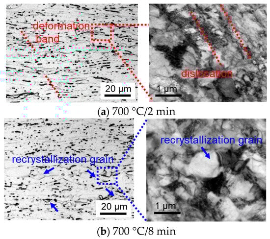 In addition, it can be seen from Figure 4 that when the cold-rolled Ti-70 alloy sheet is kept at 700 °C for about 8 min, fine recrystallization grains begin to appear along the grain boundary and deformation bands on the cold-rolled matrix [34], as shown in the marked area of the dashed frame in Figure 4b and the enlarged TEM image. The recrystallization process of the cold-rolled Ti-70 alloy sheet is basically completed after holding at 700 °C for 30~60 min, and uniform and equiaxed grains form as shown in Figure 4d,e.