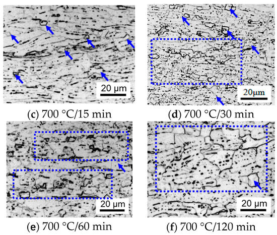 Figure 4 describes the microstructure evolution and recrystallization process of the Ti-70 cold-rolled sheets at 700 °C for different amounts of time. It can be seen from Figure 4 that the recrystallization process of cold-rolled Ti-70 alloy sheets becomes more and more complete with the increase in annealing time at 700 °C, and the recrystallization process of the material can be divided into three stages [30,31,32,33]. First is the recovery stage, as shown in Figure 4a. Micro-defects are reduced and micro-stress is released. There are still a number of dislocations in the deformed grains. The quantity of deformation bands decreases compared to the cold rolled-sheet as shown in Figure 3a. Second is the recrystallization stage, as shown in (Figure 4b–d). The recrystallized grains nucleate at the grain boundary and deformation bands and gradually replace the deformed matrix. There is almost no dislocation in the recrystallization grain as shown in the TEM image in Figure 3a. Third is the grain growth stage, as shown in Figure 4e,f. The recrystallization grain size gradually grows larger, and the average grain size of the sheet annealed at 700 °C for 120 min increases to 22 μm.