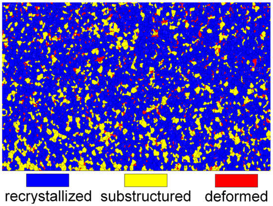 The volume fraction of the recrystallization structure marked by the blue color is 82%, the volume fraction of deformed structures marked by the red color is 6%, and the substructure (subgrain and recovery structures) marked by the yellow color accounts for 12%. This confirms that the recrystallization process of the Ti-70 alloy sheet has been fully completed and the Ti-70 alloy sheet will have an optimized microstructure and mechanical properties for further plastic processing after annealing at 700 °C for 30 min.