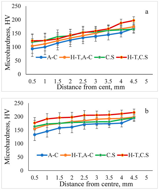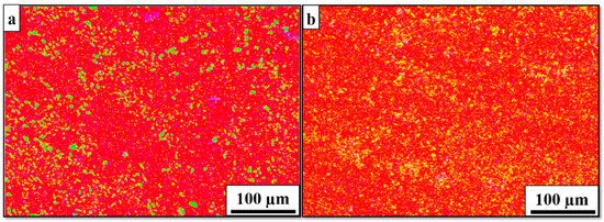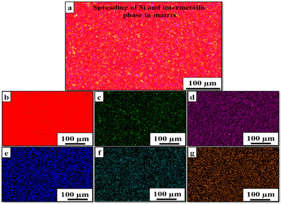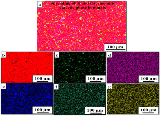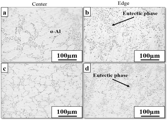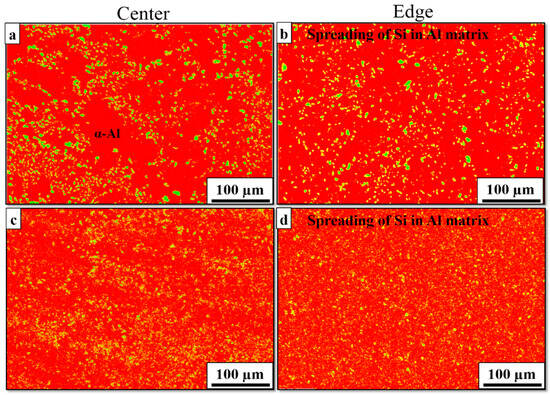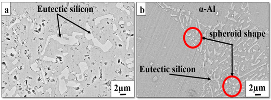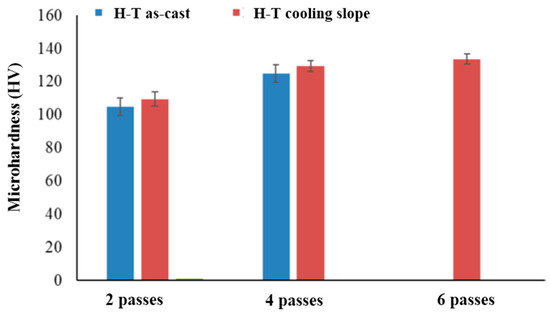 - After undergoing four ECAP passes, the microstructure of the as-cast samples displayed an elongation of the primary α-Al phase and eutectic constituents, which resulted in fine plate-like shapes having an average size of 40.4 μm. Furthermore, the size of eutectic Si particles was reduced to 0.8 ± 0.47 μm. In contrast, the microstructure of the cooling-slope that underwent six ECAP passes after heat treatment showed a more uniform and finer distribution of α-Al grains and Si particles. Furthermore, the size of the Si particles decreased to 0.7 ± 0.22 μm. The alloy hardness increased from 61 HV to 125 and 129 HV after four passes of ECAPed heat-treated as-cast and cooling-slope samples. The sample heat-treated on the cooling-slope achieved the highest hardness value of 134 HV after undergoing six ECAP passes.