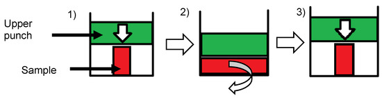 Intensive plastic deformation was conducted by the method of multiple pressing in a press-mold [41] according to the scheme shown in Figure 1.