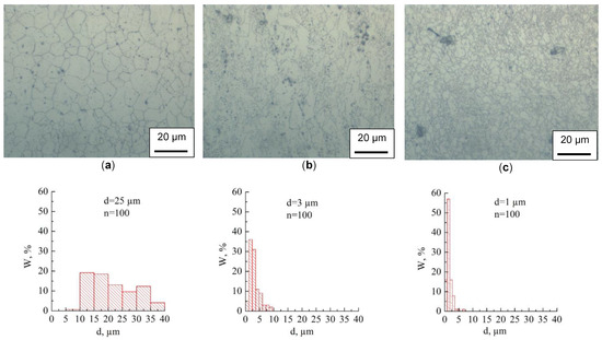 Optical images of the microstructure of the Mg–Zn–Zr–Ce alloy: (a) initial; (b) 3abc pressing; (c) 3abc pressing and rolling. Below the optical images, the histograms of grain size distribution are represented, where d—average grain size and n—number of measurements.
