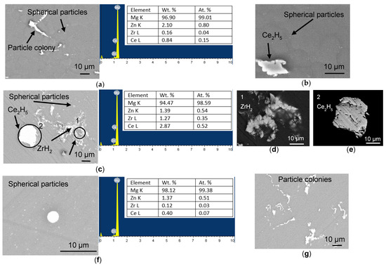 Following 3abc pressing and combined deformation (3abc pressing and rolling), SEM images reveal intermetallic phases (Figure 4c–f) that are enriched with Zn and Ce, as in the initial state. Elevated levels of zinc and cerium with varying concentrations may indicate the presence of different types of intermetallic phases. In the microstructure of the alloy subjected to 3abc pressing, several types of inclusions are present: fine spherical particles with an average size of 400 nm, colonies of fine crystalline particles, and individual Ce2H5 particles with sizes ranging from 9 to 20 µm. The maximum zinc content in these particles and colonies is 18.2%, while cerium content reaches 16.4 wt.%. In localized areas, inclusions with high Zr content up to 19 wt.% were identified (Figure 4d), which may indicate the presence of zirconium hydrides (ZrH2). The main factor contributing to the presence of zirconium and cerium hydrides is the purity of the raw materials in the alloy blend, which determines the amount of dissolved hydrogen in the alloy. The morphology of inclusions in the alloy after 3abc pressing and rolling remains unchanged. SEM images show spherical particles with sizes ranging from 0.2 to 4.2 µm and elongated colonies of particles (Figure 4f,g). The spherical particles contain zinc within a concentration range of 11.2–16.3 wt.% and cerium within the range of 6.1–9.8 wt.%. In colonies, the average zinc and cerium content can reach up to 22.6 and 22.2 wt.%, respectively.
