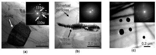 TEM images of the microstructure of the Mg–Zn–Zr–Ce alloy in the as-delivered (initial) condition: (a) α-grains; (b,c) particle colonies and individual spherical particles.