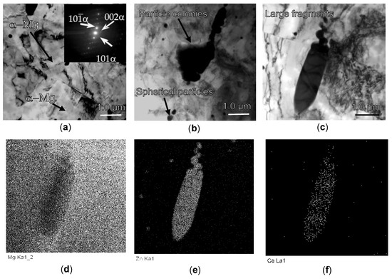 TEM images of the microstructure of the Mg–Zn–Zr–Ce alloy after 3abc pressing: (a) α-grains; (b) particle colonies and spherical particles; (c) large fragments; (d,e,f) elemental dispersion maps.