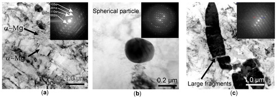 TEM images of the microstructure of the Mg–Zn–Zr–Ce alloy after 3abc pressing and rolling: (a) α-grains; (b) spherical particles; (c) large fragments.