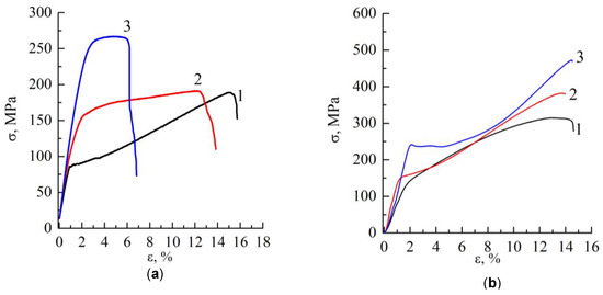 Tensile (a) and compression (b) diagrams of Mg–Zn–Zr–Ce alloy samples: 1—initial; 2—3abc pressing; 3—3abc pressing and rolling.