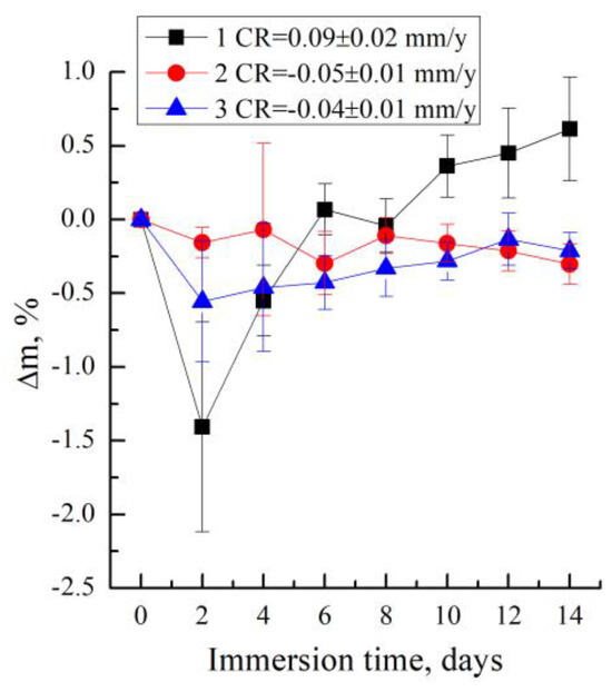 Mass loss of Mg–Zn–Zr–Ce alloy samples during the corrosion process in a PBS solution: 1—initial; 2—3abc pressing; 3—3abc pressing and rolling.