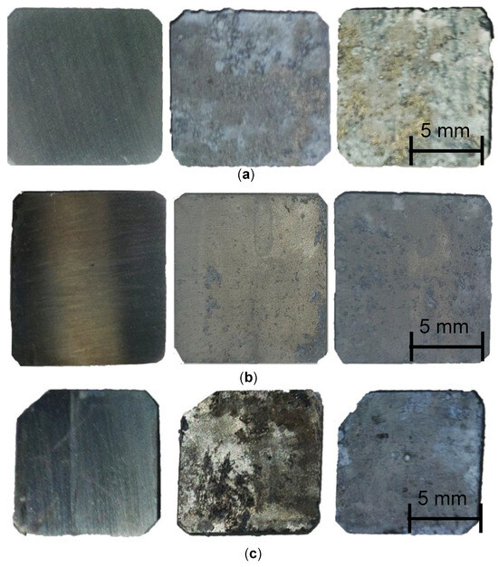Surface condition of the samples: (a) initial, (b) 3abc pressing, (c) 3abc pressing and rolling after 0, 6, and 14 days in a PBS solution.